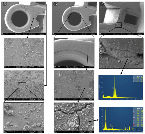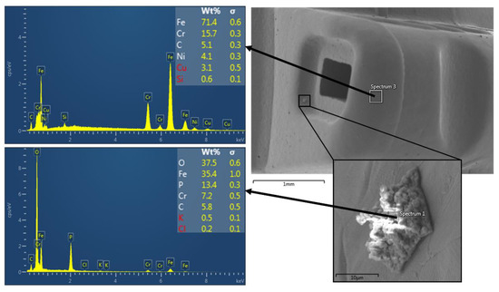 The Ag source was found near the adjacent rectangular orifice (Figure 5c): an Ag brazing material was used to weld a small metallic parallelepipedal to the main tube component. Additionally, Ag-containing particles of several shapes were spread over the surface of this component (Figure 5), preferentially located near the welded region. In this region, particles presented high Ag contents (as high as ~70 wt.%). This finding reinforces the influence of Ag-based welding in promoting corrosion of orthodontic components, as found by other authors [53,54].