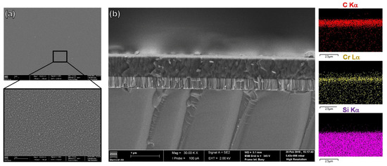 SEM (a) Surface and (b) cross-section micrographs of the a-C:H coating deposited on Si substrates and the corresponding EDS elemental distribution maps.