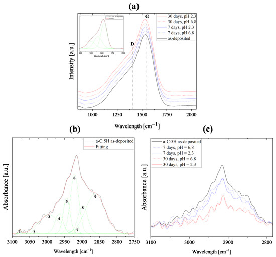 Structural characterization of the a-C:5H coatings before and after the corrosion tests by (a) visible Raman (inset: Gaussian fitting result of the as-deposited a-C:H coating); and (b,c) FTIR spectroscopy.
