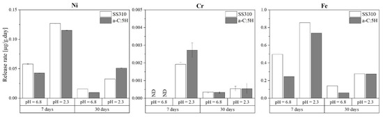 Average release rates of Ni, Cr, and Fe of SS310 and a-C:5H samples. ND: not detected.