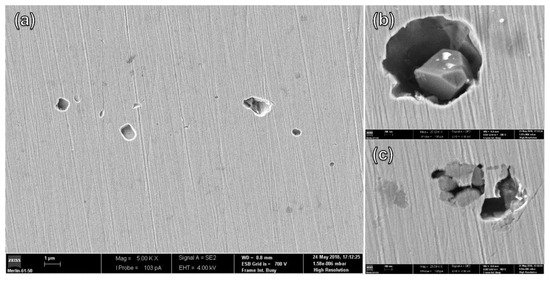 (a) SEM surface micrographs of SS310 reference samples after the corrosion test at pH = 2.3; (b,c) detailed views of pit morphologies.