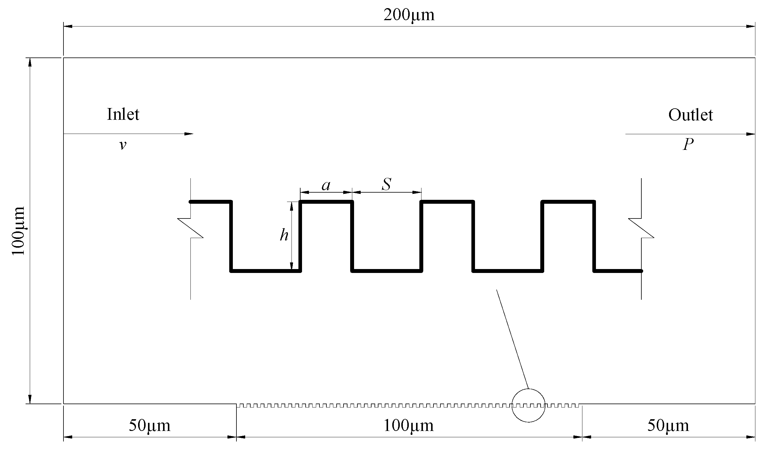 Figure 1. The lower surface simulates the slip surface by constructing a regular rectangular microstructure. The total model length was 200 μm and its height was 100 μm. The slip surface was located 50 μm from the entrance boundary to ensure that the incoming flow will fully develop, ensuring the accuracy of calculation results. Similarly, it was also located 50 μm from the exit boundary to ensure that the outflow would not affect the sliding surface flow state. The model groove depth