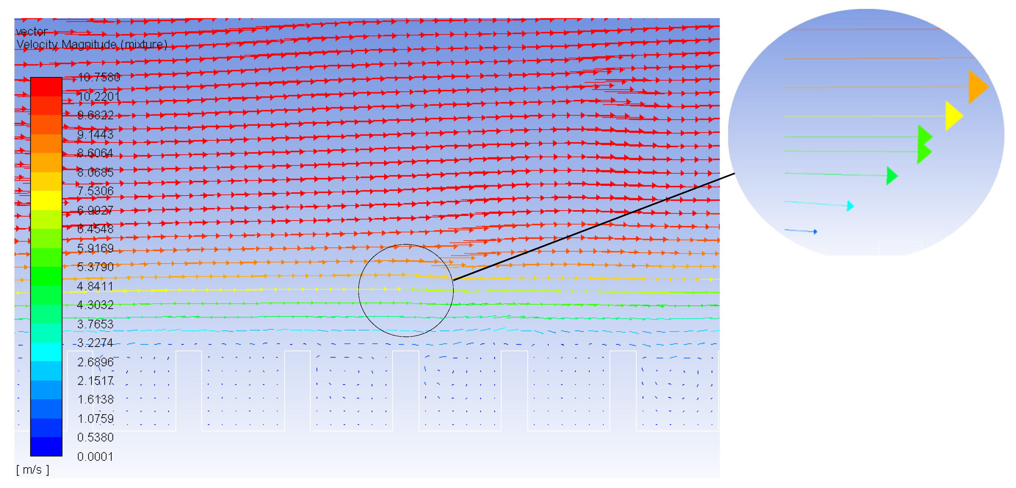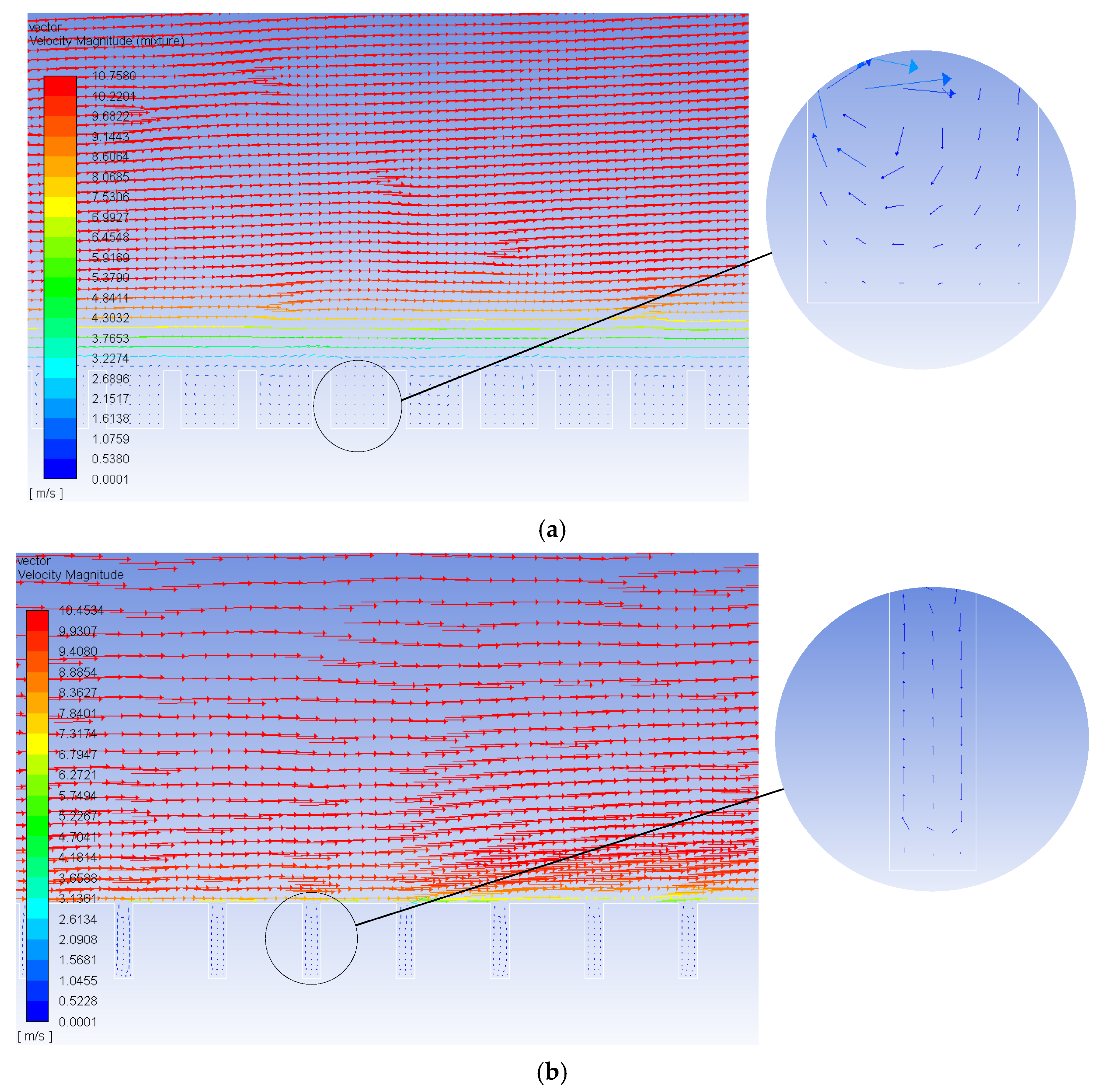 Figure 4. As can be seen from the figures, at the gas–liquid interface located at the groove top, the fluid velocity was higher near the wall; the wider the groove, the more obvious the difference. This is caused by a small amount of air trapped in the groove which formed a gas–liquid free shear interface, reducing the wall resistance and increasing the velocity. This is consistent with reference [