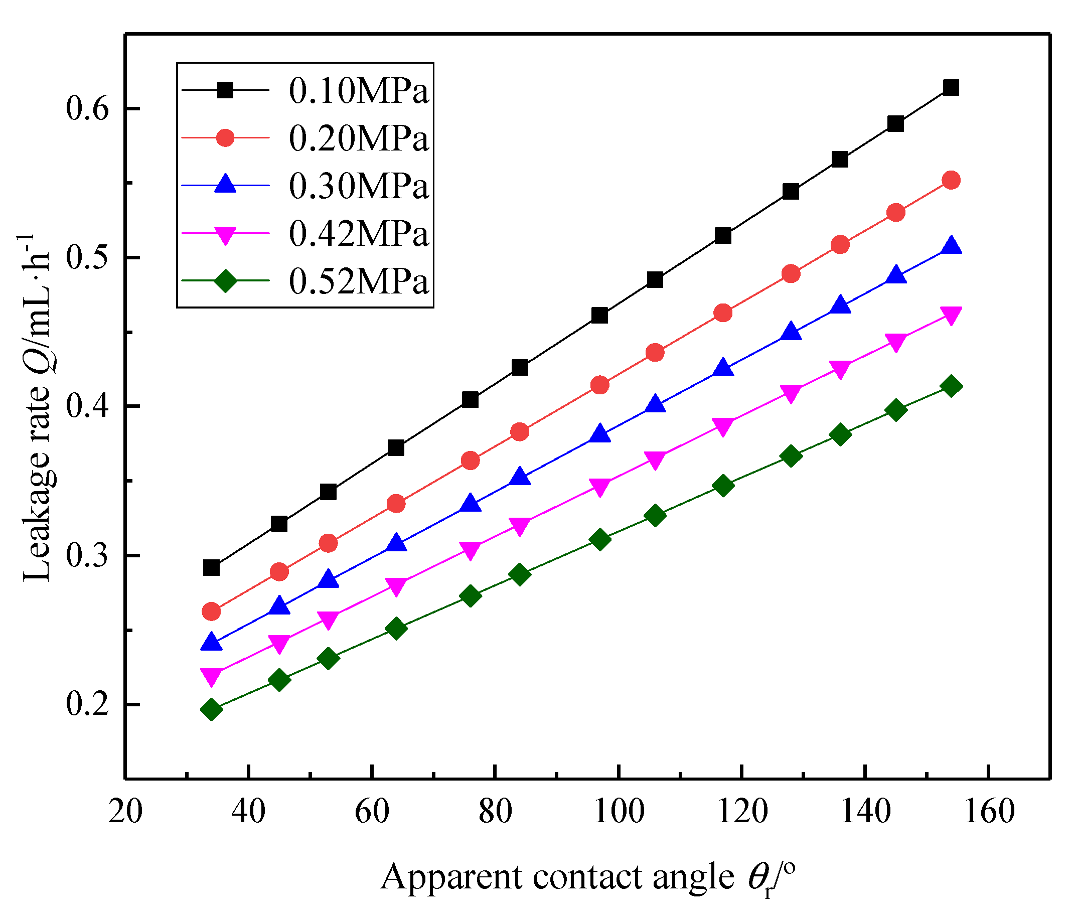 The effect of the apparent contact angle on the leakage rate under different contact pressures is provided in