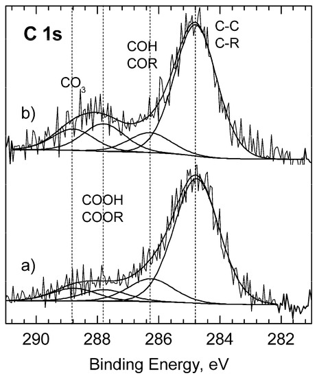 The chemistry of coating’s surface subjected to heat-treatment was analyzed by X-ray photoelectron spectroscopy (XPS) using a SPECS PHOIBOS 100 spectrometer (SPECS, Berlin, Germany) with Al source (1486.7 eV, non-monochromatized, 250 W for high resolution spectra). Ion etching during XPS analyses was carried out by Ar+ sputtering with the beam energy 4 keV and a beam current density 7.5 µA cm−2. Processing and fitting of the spectra were carried out in SPECLAB2 and CasaXPS v. 3.19 software, where a Gaussian–Lorenzian curve profile and a Shirley baseline were used. The energy 284.8 eV for the C 1s peak was used as the reference.