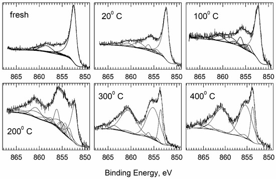 According to the XPS survey spectra (not presented here), the dominant component of “as-deposited” coating was nickel—44.8 at.% (Table 2). The analysis of particular oxidation states of nickel was performed on the basis of Ni 2p spectral regions and the chemical shifts. Ni 2p spectra together with deconvolutions for the obtained Ni coating, and the nickel coatings annealed for 2 h at: 100, 200, 300 and 400 °C, are presented in Figure 6. The main assumption during deconvolution was the presence of: Ni(0), Ni(II) and Ni(III) in the form of NiO, Ni(OH)2 and NiOOH. The whole complex deconvolution procedure has already been presented in earlier works of Winiarski et al. [1].