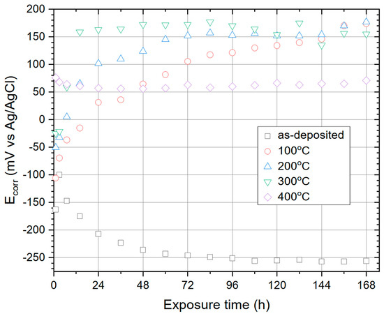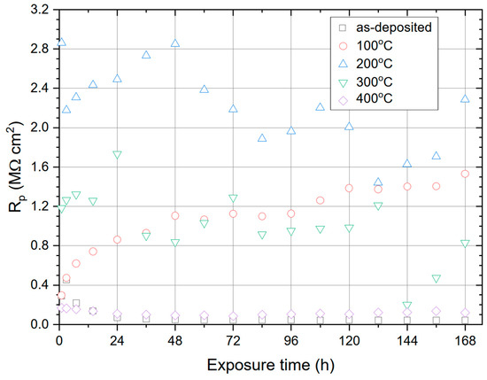 Heat treatment of nickel coatings caused a significant increase in their corrosion resistance (higher Rp values). After annealing at 100 °C, the polarization resistance measured during the entire 168-h exposure period reached values several times higher (>0.8 MΩ cm2) than those for as-deposited Ni coating (~0.1 MΩ cm2). A further increase in corrosion resistance (Rp > 2 MΩ cm2) was observed after raising temperature to 200 °C (Figure 7). One possible reason for the increase in Rp is the formation on the coatings surface was a relatively compact layer consisting mainly of NiOOH and NiO. Another reason may be the reduction of active area on the coatings’ surface during heat treatment, as reported by Laszczyńska et al. [4] and Popczyk et al. [21]. At 300 °C, however, the corrosion resistance decreased. Further heat treatment at 400 °C caused that the change in polarization resistance (both in terms of trends and the values) became similar to that of as-deposited Ni. What is interesting, is that the corrosion resistance of the obtained nickel coatings varied depending on the heat treatment temperature in a manner similar to the microhardness (Table 1). Microhardness (Table 1) reached its maximum for coating annealed at 200 °C. These results are consistent with the SEM analysis (Figure 3), which showed a clear transition in the morphology of the heat-treated coating above that temperature. It can be assumed that the increase in the porosity of the coatings (observed in Figure 4c,d) translated into the deterioration of its anti-corrosion properties.