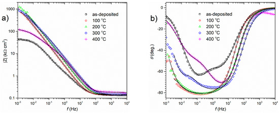 The results of the fitting are presented in Table 4. Only for the coating annealed at 400 °C the calculation of a double layer capacitance (Cdl) required a different approach. It turned out that only in the case of this coating it was necessary to use the CPE element, as the pure capacitor did not allow for a good fit. The effective capacitance, Cdl,surface (F cm−2), was calculated according to Hirschorn et al. [23] from Equation (4):