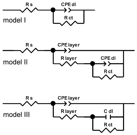 Randles circuit (model I in Figure 10) is usually a good starting point for any consideration. However, the use of a model that would simulate not only the Faradaic process, but also the properties of the oxidized layer on heat-treated nickel coating (the presence of which was evidently demonstrated by previous spectroscopic and microscopic analyzes) turned out to be more favorable for consistent interpretation of all the results presented in this work. Ultimately it was decided to use model II, but with a minor modification—model III in Figure 10. In this model it was possible to use a capacitor instead of CPE to describe the double layer capacitance (Cdl). This choice was dictated by the literature research on passive layers for stainless steels, nickel, titanium and aluminum using the EIS technique.