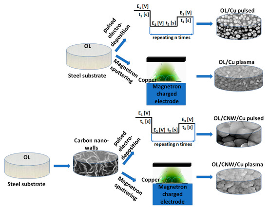 Considering improved mechanical properties (wear resistance, Vickers hardness) and improved electrical properties obtained in the case of carbon nanostructures/copper coatings described in the literature [28,33,34,35], the purpose of this study was to use CNW as an intermediate layer for the copper deposition on steel surface and to assess their influence on coating properties. Such structure may find application in various domains, for example, improvements of the mechanical properties of the fragile CNW layers by their reinforcement [40], obtaining a low friction coefficient and less wear surfaces [41], and improvement of heat transfer, allowing superior thermal dissipation.