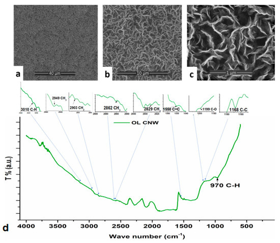 SEM images of carbon nano-walls deposition on K455 steel at different magnifications (a–c), and FT-IR spectra for OL/CNW (d).