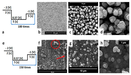 Copper pulsed electrodeposition at 100 and 150 pulses. Schematic representation of applied pulses (a,e) and top view SEM images at different magnifications (b–d,f–h).