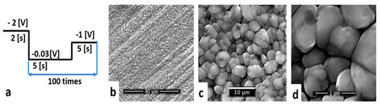 In a first experiment, a constant potential deposition for 20 min at 50 °C was performed. The aim of this experiment was to select a proper voltage having as result a uniform deposited copper layer, without cracks and large pores. For electrodeposition, experiments were made at 0.7, 1, 1.5 and 2 V. Samples obtained at 0.7 and 1.5 V, shown in Figure 4a,c, have large pores, which will not be beneficial for envisaged coating applications. For a sample prepared at 1.5 V, as shown in Figure 4c, the grains are not uniform. The sample at 2 V, shown in Figure 4d, has micropores and the grains are not uniform. The best results (uniform deposition, without irregularities, with uniform small grains, without big pores) were obtained for 1 V applied potential, as shown in Figure 4b. As a conclusion from this experiment, we selected the potential of 1V for the next experiment—pulsed electrodeposition.