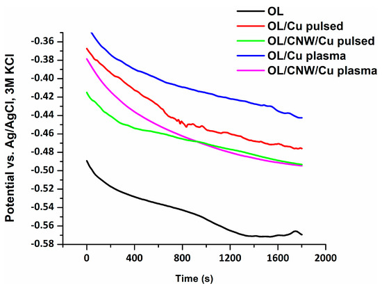 OCP determination in NaCl 0.9% for 1800 s revealed an electropositive potential shift of more than 100 mV for all coated samples comparing with uncoated OL, suggesting a corrosion surface stabilization after deposition (Figure 10). For all the investigated samples the potential showed a drop of approximately 50 mV followed by a slight stabilization tendency. Comparing OL/Cu pulsed with OL/CNW/Cu pulsed and OL/Cu plasma with OL/CNW/Cu plasma it can be seen that the presence of CNW brings a slight decrease in potential.