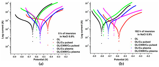 For the sample OL/Cu pulsed (Figure 12), the corrosion rate is decreasing in time up to 0.01 mm/year after 192 h of immersion in NaCl 0.9%, a value lower compared to untreated OL. This is in good correlation with SEM images, in which a uniform copper layer without cracks is visible, in Figure 4b–d. For OL/CNW/Cu pulsed (Figure 12), the corrosion rate falls suddenly after the first 24 h and continues to remain lower than 0.14 mm/year for the next 192 h. Both pulsed samples present a decreasing tendency of the corrosion rate. However, CNW presence increases the corrosion rate in this case, probably due to the heat treatment performed before the Cu deposition. To test this hypothesis, an additional measurement of the Tafel plot was performed on an OL thermal treated in similar conditions (100 °C for 2 h). The results confirmed this hypothesis, the corrosion rate being higher after thermal treatment, 0.15 mm/year comparing with 0.088 mm/year and for OL.
