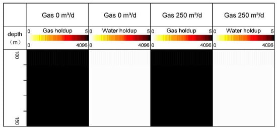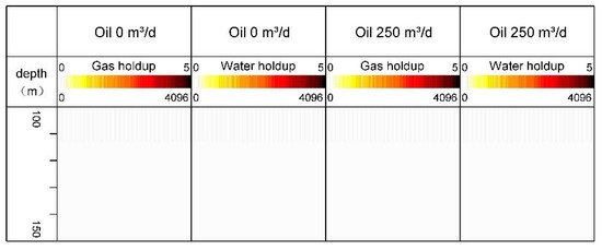 During the test, the instrument calibration was first carried out, and the calibration measurement was carried out when the flowrate of pure gas, pure water and pure oil were 0 and 250 m3/d, as shown in Figure 2, Figure 3 and Figure 4. The scale 0–5 indicates the probe serial number, and the lower scale 0-4096 indicates the range of the probe response value. When the value was 0, it was pure white, and when the value was 4096, it was pure black. As the response value increased in the middle part, the black became deeper and deeper. A holdup mapping analysis was conducted of the data measured in pure gas. As shown in Figure 2, at 0 and 250 m3/d, the water holdup was low, and the gas holdup was high. A holdup mapping analysis was conducted of the data measured in pure water. As shown in Figure 3, at 0 and 250 m3/d, the water holdup was high and the air holdup was low. A holdup mapping analysis was conducted of the data measured in pure oil. As shown in Figure 4, at 0 and 250 m3/d, the water holdup and gas holdup response were both low values. The scale of pure oil and pure water found that the fiber probe can effectively identify the gas, and the resistance probe can effectively identify the water. Comparing Figure 2, Figure 3 and Figure 4, it can be found that a single probe can only identify gas or water, but cannot accurately identify oil; however, the combination of resistance and optical fiber probes can be used as a new method to identify oil.