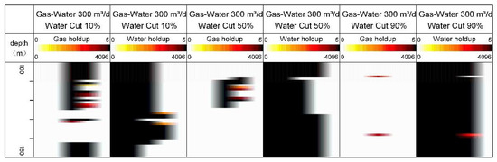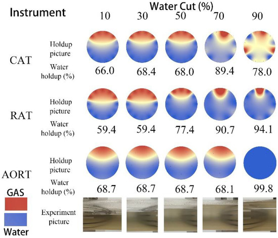 As shown in Figure 7, according to the experimental photos, it can be found that when the total flowrate of gas and water is 300 m3/d, the gas and water are separated. With the increase in the water cut, the height of the liquid level continues to rise, and the water holdup also constantly increases. The image obtained by interpolation of the data measured by CAT, RAT and AORT was compared with the experimental photos. In the case of separation of gas and water, the measured data of CAT and RAT can reflect the phenomenon that, as the water cut increases, the water holdup increases. The effect of RAT is better, which is closer to the experimental gas–water interface and water holdup; although AORT leads to a change in water holdup, the effect is slightly worse. However, the analysis showed that it is possible to use a combination of AORT and RAT instruments to perform gas–water two-phase measurements, use the AORT instrument to identify the fluid, determine the approximate range of the gas–water interface, and use the RAT data to perform further imaging calculations to obtain increased accuracy regarding the gas–water interface and gas holdup.