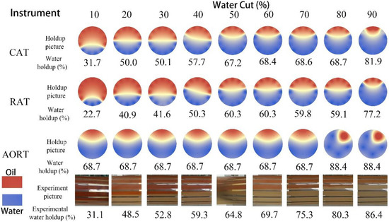 As shown in Figure 8, the experimental photos show that when the total oil–water flowrate is 30 m3/d, the interface height of the oil–water layer increases with the increase in the water cut, and the water holdup also increases. The image obtained by interpolation of the data measured by CAT, RAT and AORT can be compared with the experimental photos. In the case of oil–water layers, the measured data of CAT and RAT can reflect the phenomenon that, as the water cut increases, the water holdup increases. The effect of CAT is better, as it is closer to the experimental oil–water interface and water holdup; although AORT has a change in water holdup, the effect is slightly worse. However, the analysis shows that the combination of AORT and CAT instruments can be used to measure the oil and water phases. The AORT instrument is used for fluid identification to determine the approximate range of the oil–water interface, and the CAT data are used for further imaging calculations to obtain accurate oil and water interface and water holdup.