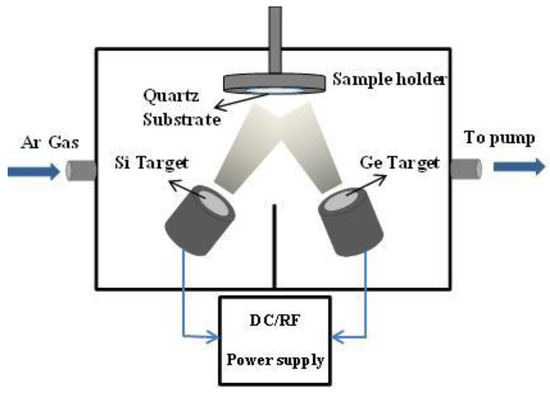 The p-type SiGe films were deposited on a pre-cleaned quartz substrates using single-crystal heavily doped p-type Si (99.9999% pure and ρ = 0.005–0.020 Ω.cm), and single-crystal n-type Ge (99.999% pure and ρ > 0.1 Ω.cm) targets by DC/RF Magnetron Sputter-NanoPVD (Model: S10A, Moorfield, UK). Figure 1 shows the schematic diagram of the deposition process of the SiGe films by co-sputtering of Si and Ge. The chamber was evacuated to the base pressure of 4.73 × 10−7 mbar. The highly doped p-type silicon (Si) target was used as a DC source and the low doped n-type germanium (Ge) was used as the RF source. Argon (Ar) was used as the sputter gas with a flow rate of 9.6 sccm. The deposition was carried out at room temperature with a rotating substrate (rotation speed of 2 rpm). Pre-sputtering was carried out to clean the surface of the targets with closed shutters to avoid any contamination of the deposited film. The deposition time was 4 h. Details of the growth parameters are given in Table 1.