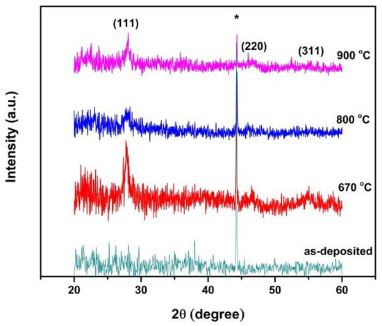The XRD patterns of the as-deposited, 670, 800, and 900 °C annealed thin films of the SiGe alloy over the quartz substrates are shown in Figure 3. The XRD pattern of the as-deposited SiGe film demonstrated an amorphous nature. However, a peak marked as (*) belonged to an aluminum sample stage (JCPDS#: 00-004-0787). The XRD patterns from the samples annealed at 670, 800, and 900 °C showed that the SiGe alloy peaks at ~28°, 46°, and 55.3° related to (1 1 1), (2 2 0) and (3 1 1) planes of the SiGe alloy, respectively. The (1 1 1) peak was of a relatively high intensity and the presence of higher order peaks showed that the annealed SiGe films were crystalline in nature. A decrease in the intensity of all the peaks was observed from measurement to measurement, which occurred due to the apparatus artifact. The relative increase in the intensity of the (1 1 1) peak with an increasing annealing temperature showed improvement in the crystallinity of the SiGe thin films. The crystallite sizes of the annealed films were estimated with respect to the dominant peak (1 1 1) using Scherrer`s formula, given by the following Equation (2):