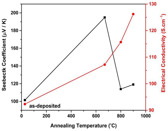 The variation in the value of the Seebeck coefficient and the electrical conductivity, measured at room temperature with an annealing temperature, is presented in Figure 8. The value of S is highest for the 670 °C annealed p-type SiGe thin film and is equal to 195 μVK−1, which is greater than the typical bulk p-type SiGe alloy (121 μVK−1) [19]. For the 800 °C annealed sample, S decreased to ~114 μVK−1 and slightly increased for the 900 °C annealed sample, in accordance with the Seebeck voltage. This behavior can be attributed to the increase in carrier concentration with a change in the Ge content in the SiGe thin films at a higher annealing temperature, as S has an inverse relation with the carrier concentration [20,21]. In other words, at 670 °C, the structure of the SiGe thin film transformed from amorphous to crystalline, which resulted in the enhancement of the Seebeck coefficient. With a further increase in the annealing temperature, the increase in the Ge content caused an increase in carrier concentration, which decreased the Seebeck coefficient value. The Seebeck coefficient value of all the annealed SiGe thin films was greater than the as-deposited samples. The sign of S was positive, indicating that the dominant charge carriers for the deposited thin films were holes.