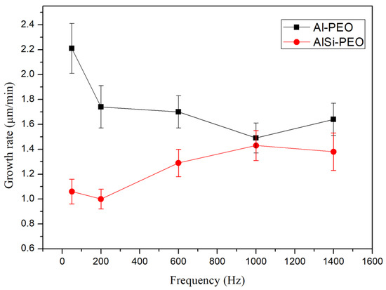 - Coatings produced on Al and AlSi substrates at changing frequencies show different growth patterns. With an increasing frequency, both the growth rate and the porosity of the Al-PEO coatings tend to decrease and a large number of closed-pore structures can be observed in the coatings. However, the growth rate and porosity of the AlSi–PEO coatings have a tendency to increase with rising frequency and many open-pore structures occur in the coatings. This is mainly attributed to the concentrated discharge induced the by Si phase with low impedance.