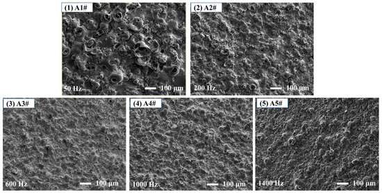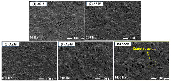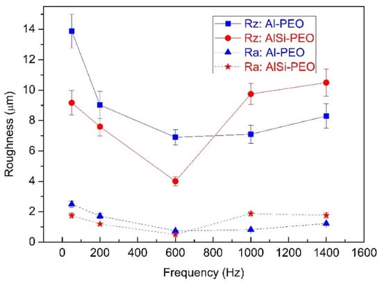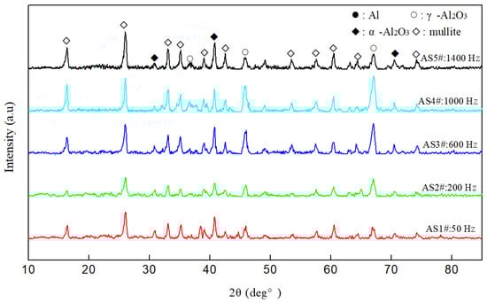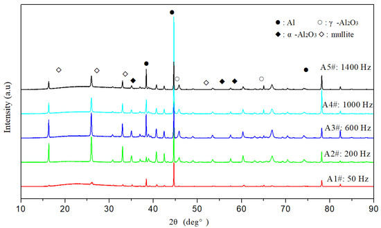 - The mullite phase in the Al-PEO coatings disappears with a rising frequency. This is because the Si phase in the Al-PEO coatings mainly comes from the Na2SiO3 electrolyte solution and an increase in frequency will dissociate more SiO3 from the coating surfaces. However, the mullite phase in the Al-PEO coatings tends to increase as the frequency rises. This is because the AlSi substrate contains a large amount of Si and a reduction in the single-pulse energy can enhance the edge effect produced during bulk Si discharge, making more Si elements enter the coatings and increasing the mullite phase.
