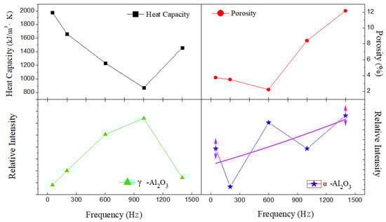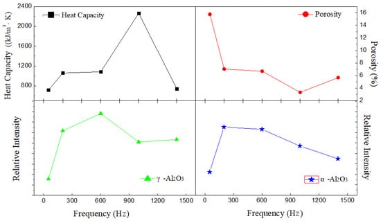- The pore morphology and the quantity of pores in coatings have different impacts on the heat capacity and the heat conductivity. When Al-PEO coatings are prepared at a high frequency and AlSi-PEO coatings at a low frequency, concentrated discharges occur and a large quantity of small-size closed pores are observed in coatings, which leads to a dramatic reduction in the heat capacity and the thermal diffusivity. At a high frequency, a quantity of open pores occurs in AlSi-PEO coatings (e.g., AS5#), which enhances the thermal convection in coatings, leading to increased thermal diffusivity. However, an excessive number of or oversized open pores (e.g., A1#) often results in a decrease in the coating density, which can reduce the volumetric heat capacity of the coatings, thereby indirectly decreasing the heat conductivity.