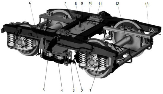 Design of KVZ-TsNII M Car Bogie: 1—axle-box suspension; 2—bracket; 3—elongated shackle; 4—central suspension; 5—hydraulic shock absorbers; 6—radius rods; 7—frame; 8—centre pivot; 9—centre bowl; 10—truck bolster; 11—side bearings; 12—two wheelsets; 13—brake rigging.