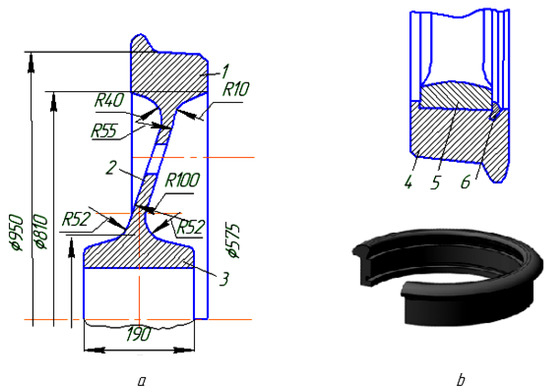 According to their structural elements, the wheels of railway cars may be divided into tyreless (one-piece) and tyred (composite) wheels (Figure 2a,b).