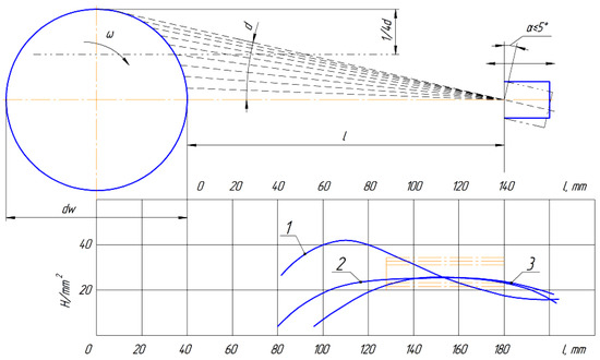 The main reason for cracking when spraying with the PN 35T75 powders was overheating. With repeated spraying, the surface of the substrate overheated and unevenly expanded with the base of the part, microcracks reappeared, and adhesion (adhesion strength) decreased. It was experimentally established that the cracking and adhesion of the coating are affected by the spraying mode (J is the current strength (A), U is the voltage, and V and l are the spraying distances (mm)). According to the results of the production experiment with the Remplasma LLP restoration technology, the dependence of the adhesion strength and the level of cracking of the coating on the spraying distance were established as y = −0.0667x2 + 0.9018x + 1.7667 (Figure 3).
