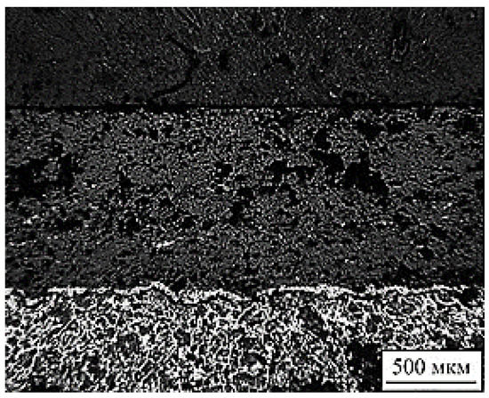 Sample “1”: As a result of visual inspection, a large number of pores and additional inclusions were noted in the structure of the sprayed material. The thickness of the sprayed layer was 2–3 mm. The microstructure of the deposited metal consisted of medium-needle martensite and doped ferrite, separated along the boundaries of the primary austenitic grains during the crystallization of the deposition (Figure 5).