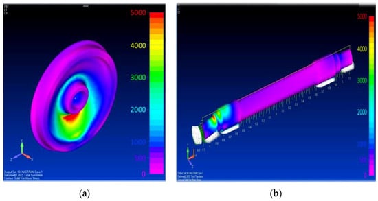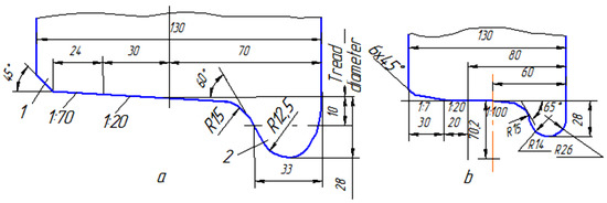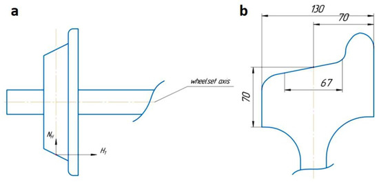 The technical condition of the wheelset of a platform and the process of interaction between the contact tread surface and the rail, which is accompanied by large dynamic loads, have significant impacts on the efficiency and safety of freight car operation [1,2,3,4,5,6,7]. The range of changes in a cyclic load directly depends on the intensity of changes in the design profile of the wheel (such as abrasion challenges), operating modes (speeding up and braking) and the sum moments of forces that occur during different periods of wheel contact [8,9]. The durability of the wheelset of a railway car largely depends on the dynamic and strength characteristics of the wheel, as well as on the design features and recovery material of the car bogie (Figure 1).