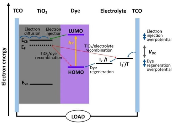 - Wang, Q.; Ito, S.; Grätzel, M.; Fabregat-Santiago, F.; Mora-Seró, I.; Bisquert, J.; Bessho, T.; Imai, H. Characteristics of High Efficiency Dye-Sensitized Solar Cells. J. Phys. Chem. B 2006, 110, 25210–25221. [Google Scholar] [CrossRef]
