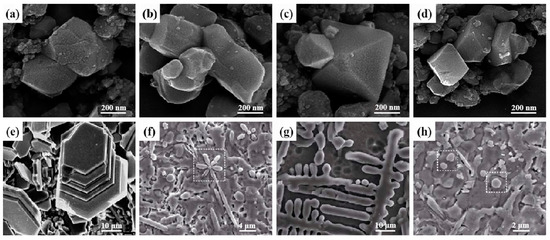 Typical morphologies of TiCx: (a) polyhedron shape, (b) cuboctahedron shape, (c) octahedron shape, (d) truncated octahedron shape, (e) hexagonal shape, (f) petaloid shape, (g) dendritic shape, (h) spherical shape.