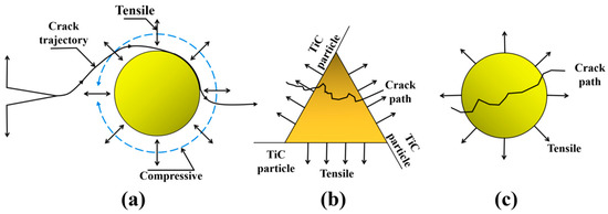 The toughening mechanism of particle reinforced TiC-based ceramics is shown in Figure 8. Due to the mismatch of thermal expansion coefficient and elastic modulus between TiC and the second phase (Δα = ~2.6 × 10–6 °C−1, E = 451 GPa), resulting in a residual fluid net tension in the second phase particles. The second phase particles will be subjected to both circumferential compression and radial tension. Figure 8a shows that when cracks move around the particles, they will be attracted to the surface of the particles (tensiile radial stress axis). Figure 8b,c show the tensile state of grain boundary phase and grain phase, respectively, so the main modes of particle phase reinforcement are from intergranular to transgranular [86] and crack deflection.
