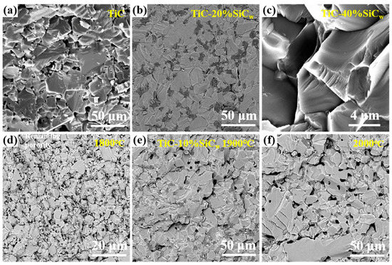 Microstructure of TiC-SiCW composite ceramics. (a) TiC, (b) TiC-20%SiCw, (c) TiC-40%SiCw. (d) TiC-10%SiCw sintered at 1800 °C, (e) TiC-10%SiCw sintered at 1900 °C, (f) TiC-10%SiCw sintered at 2000 °C.