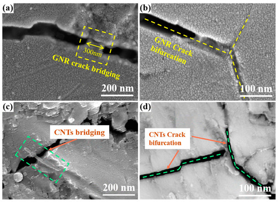 The bridging of GNR is also related to its high thermal conductivity, the wide GNR formed in situ has a high interface area, as shown in Figure 12a. Therefore, the crack propagation through GNR needs to consume more fracture energy, which is due to the high elastic modulus of GNR. As shown in Figure 12b, cracks are difficult to propagate through GNR, and generally it will propagate around GNR [90]. The results show that with the increase of crack propagation path, more and more energy will be consumed in the process of crack propagation [91]. So, the fracture toughness of TiC monolithic materials is improved from 3.1 MPam1/2 to 7.4 MPam1/2, which is close to 138%. This kind of report is also common in other ultra-high temperature ceramic composites [92,93]. The deflection and bridging effects of carbon nanotubes on matrix cracks are shown in Figure 12, when the crack propagates near the CNTs, due to the high modulus of CNTs, it cannot be penetrated by the crack, and some cracks will bypass it, resulting in crack deflection (Figure 12d). For some CNTs with specific distribution, the cracks will be bridged by CNTs, and the closing stress is added to the crack surface, and the crack propagation is prevented, which plays a role in toughening (Figure 12c). Two toughening modes of CNTs and GNR are shown in Figure 13. The bridging and deflection of carbon nanotubes are shown in Figure 13a,b. Due to the excellent thermal conductivity of CNTs, some TiC grains have partially re-melted during sintering, CNTs are embedded in TiC grains, crack propagation is greatly hindered. The crack propagation is also hindered by the fine grain region and high-density region of the matrix material.