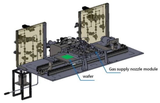 The key design of the self-developed APALD equipment is the introduction of a spatial matrix nozzle module design. The working principle of the matrix gas nozzle module can be elucidated pictorially as shown in Figure 3. The Al2O3 film is deposited on the substrate that has concurrently undergone the back and forth movement. Once the saturated reaction is completed over the substrate surface, the by-products and excess precursors are then blown away with inert gas. The matrix gas shower is designed to separate the precursor from the inert gas, and the reaction is divided into multiple different areas. The inert gas forms a gas curtain between TMA and H2O. The gas curtain can prevent the reaction zones from reacting with each other. If the film cannot be deposited smoothly or pollution has ever occurred, the air extraction system is used to purify the pipeline to ensure the film quality and surface morphology. The space matrix design renders the gas deliveries more uniform after the TMA and H2O precursors enter the reaction chamber, and at the same time, the interactions can be avoided among the precursors to form dust, which would affect the film quality and film uniformity [].