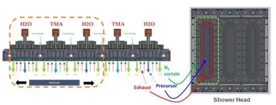 Among them, the atmospheric pressure atomic layer deposition (APALD) process independently developed by our research group is different from the traditional vacuum equipment. It has a better film deposition rate, potentially leading to an increase in the production rate. It can achieve the required production capacity through stacking process cycles. The space-divided array nozzle module system is used to develop APALD; that is, the reactant feed is no longer alternately sent to a reaction chamber, but the reaction chamber is divided into multiple different sections. These reaction sections are separated by an internal air curtain, and the air shield also acts as a compartment between the reaction sections to prevent cross-reaction and parasitic precipitation on the reaction chamber wall [,]. The very design improves the deposition reaction and the speed of the precursors purging, thereby greatly improving the deposition efficiency without losing the usual advantages of ALD []. The common precursors for depositing Al2O3 films using ALD are trimethylaluminum (TMA) and H2O, both of which are volatile liquids, thus they are easy to control and inexpensive in the process [].