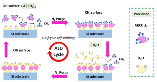 There are many techniques for depositing Al2O3 thin films, such as common plasma-assisted chemical vapor deposition (PECVD) [,], atmospheric pressure chemical vapor deposition (APCVD) [], sputtering technology [,], the sol–gel process [], pulsed laser deposition [], and atomic layer deposition (ALD) [,]. Using ALD to deposit Al2O3 film has many advantages. Its Al2O3 film and the underlying silicon substrate have good thermal and chemical stability, and can achieve a high-quality Si/Al2O3 interface [].