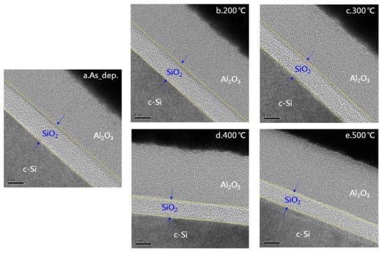 First of all, the structural characteristics of the Si/Al2O3 interface under the influences of different annealing conditions were evaluated through the field emission transmission electron microscope (FE-TEM, JEM-2100F, JEOL, Tokyo, Japan). Figure 6a–e depict several FE-TEM images of Al2O3 deposited on a silicon substrate which reveal the details of the Si/Al2O3 interface in the pristine condition and also after the microwave annealing treatment conducted at a temperature ranging from 200–500 °C. The resultant thickness variations of the Al2O3 and the SiO2 layers at the Si/Al2O3 interface are presented in Figure 7 for comparison. As observed in Figure 6, an extremely thin SiO2 layer between Si and Al2O3 play an important role in passivating Al2O3. When investigated in detail, the SiO2 surface reveals a slight change in appearance. Further analysis and discussion follow, conducted through EDS.