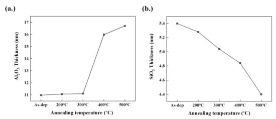 Figure 7a shows that the unannealed Al2O3 film thickness is around 10.99 nm after APALD deposition, and the film becomes thicker when increasing the annealing temperature. The film thickening is not apparent initially at the temperature of 200 and 300 °C, and the respective thicknesses are found to be 11.07 and 11.11 nm. However, as the temperature exceeds 400 °C, the thickness noticeably rises to 15.99 nm, and the trend then levels off at 500 °C with a thickness of 16.71 nm. This phenomenon is ascribed to the additional energy provided by the microwave field to diffuse the Al, and as the microwave energy increases, the Al diffusion at the Si/Al2O3 interface is accentuated.