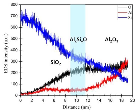 For the interface analysis, energy dispersive X-ray spectroscopy with a transmission electron microscope (TEM-EDS) was used to analyze the ALD-deposited Al2O3 material. From the EDS data shown in Figure 8 and Figure 9, noticeable changes in the film compositions were identified due to the annealing []. The different EDS line scans corresponding to Al Kα, O Kα, and Si Kα were extracted from the spectral image data []. According to the TEM image, other components in addition to SiO2 are discovered in the vicinity of the Si/Al2O3 interface when it was annealed at 200–400 °C as compared with the unannealed sample. When using the EDS to reveal the unknown constituents [], Figure 8 shows that the interface subjecting to the 400 °C treatment contains an aluminosilicate AlxSiyO layer, which is further decomposed by the energy of high-temperature microwave annealing to form a SiOx and an Al2O3 layer []. In other words, the thermal diffusion and rearrangement of oxygen, aluminum, and silicon atoms all contribute to a distinct Si/SiO2/Al2O3 structure with a steep interface. The foregoing phenomenon has been improved as shown in Figure 9, when the microwave annealing temperature is elevated to 500 °C.