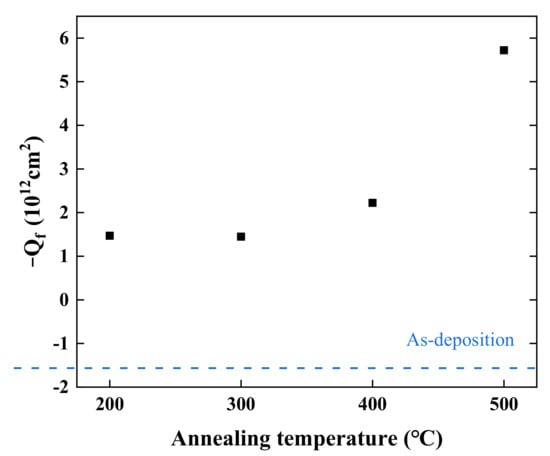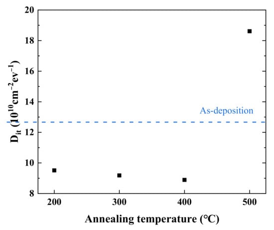 Since the surface lattice defects of the silicon substrate seriously bring about unwanted electronic recombination, the importance of passivating the surface of the wafer, therefore, cannot be overemphasized. From the following Dit analysis results, it is clear that the oxygen in SiO2 film could combine with the dangling bonds on the silicon substrate to produce a chemical passivation effect. The use of APALD to deposit films is the key to delivering high-quality passivation. It can be seen from Figure 12 that Dit is 1 × 1011 cm−2 eV−1 before the film is annealed, and the lowest Dit achieved is 8.89 × 1010 cm−2 eV−1 when the film is annealed at 400 °C, whereas for other temperatures, Dit values of 9.51 × 1010 cm−2 eV−1, 9.18 × 1010 cm−2 eV−1, and 1.86 × 1011 cm−2 eV−1 are determined at 200, 300, and 500 °C, respectively. The non-thermal effect of microwave annealing also plays a significant role in the recrystallization and defect repair of silicon. When the recrystallization process is almost complete and the defects are mostly repaired, both the non-thermal and dielectric polarization loss effects are dramatically weakened. Microwave annealing can significantly reduce the peak temperature of silicon recrystallization or defect repair annealing within a shorter time frame, but the excess energy and time provided by microwave annealing could inexorably lead to the generation of traps and defects []. Thus, it becomes obvious that the defect density can be noticeably curtailed through the precise energy control of microwave annealing.