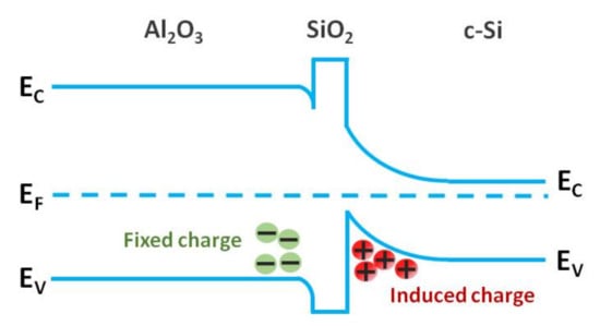 As shown in Figure 10, initially the fixed charge is positive (Qf ~ 1.56 × 1012 cm−2) before attempting the microwave annealing, and as the microwave annealing temperature increases from 200 to 500 °C, Qf becomes negative, and the value of the so-called negative fixed charge, or −Qf, increases with the temperature. At the temperature of 200 and 300 °C, when the annealing energy provided is not sufficient, the respective values of Qf that are obtained, that is, −1.47 × 1012 cm−2 and −1.45 × 1012 cm−2, are virtually similar to one another. However, when the microwave annealing temperature is increased to 400 °C, the Qf value reaches −2.22 × 1012 cm−2, and the best −Qf obtained is −5.72 × 1012 cm−2 at 500 °C. The presence of the negative fixed charges critically affects the efficacy of the Al2O3 field passivation, which in turn can be elucidated using the band diagram of the Al2O3/SiO2/c-Si structure depicted in Figure 11 below. The negative fixed charges tend to induce the positive charges at the SiO2/c-Si interface. Judging the overall Qf values obtained, a high charge density is obtained from the Al2O3 deposited by the APALD equipment independently developed by our research team []. In addition, microwave annealing also contributes to the improvement in the quality of the SiO2 layer.