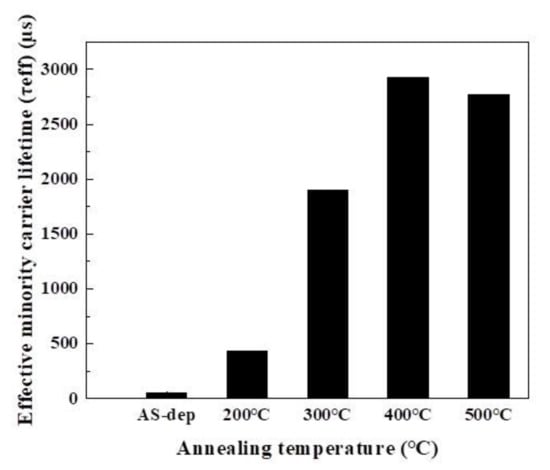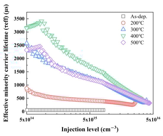 The values of τeff shown in Figure 14 are extracted under the high injection level of 5 × 1015 cm−3. It shows that τeff before annealing is only 54.60 μs, whereas at 400 °C, τeff becomes 2925.03 μs, which is the best result among all trials attempted, and in comparison, the other underperformed counterparts are 432.05 μs at 200 °C, 1895.59 μs at 300 °C, and 2772.97 μs at 500 °C. The effective minority carrier lifetime (τeff) is one of the most important indicators for evaluating the passivation effect, and this indicator can be used to determine the best process parameters for the post-annealing process. As a whole, by using the microwave annealing method, a long effective minority carrier lifetime (τeff) can be achieved with a relatively short annealing time and at a low temperature, which is all benefited from the unique microwave annealing mechanism and the non-thermal effect. Comparing microwave annealing with traditional furnace annealing, at least 75% of the time cost can be saved accordingly [], which is very attractive for the commercial process of manufacturing solar cells.