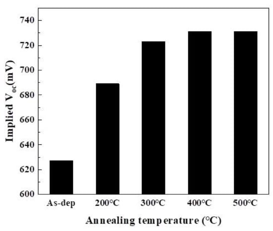 The implied open-circuit voltage of Si/Al2O3 samples being treated with different annealing temperature conditions.