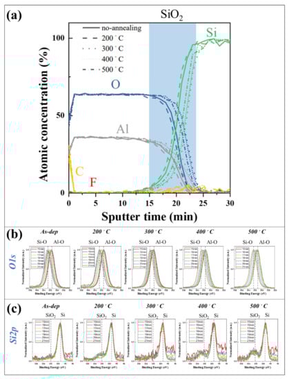 To better understand the element ratio and element valence changes at different depths, XPS is used to conduct elemental depth analysis on samples under different annealing conditions. XPS uses an X-ray as the emission source to excite the inner shell electrons of the element as photoelectrons, and the subsequent kinetic energy of the photoelectron detected would reflect the magnitude of its binding energy. Different elements naturally have different binding energies. Based on this concept, the concentrations of the different elements can be estimated to achieve accurate quantitative analysis. For that matter, because the binding energies of different elements are expected to deviate from one another slightly, the valence states of the different elements can be identified. XPS not only can deliver two-dimensional surface scanning, but it can also couple with sputtering to perform one-dimensional in-depth analysis for interfacial probing as well. In this study, XPS was used for elemental depth analysis, focusing on the O1s and Si2p spectra at the interface, and observing the valence changes at the interface [].