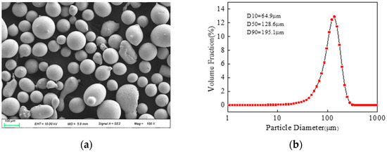 27SiMn steel (100 × 50 × 10 mm) was used as the substrate, and its chemical composition is listed in Table 3. Prior to the laser cladding, the substrate was grinded and ultrasonically cleaned with ethanol to remove stains from the surface. The gas atomized Fe-based alloy powder was used as source material for laser cladding, and the chemical composition is shown in Table 4. The powder morphology in Figure 1a shows a spherical shape, and the average particle size shown in Figure 1b is 100 μm, measured by a laser particle size distribution analyzer (LS-809, Dandong Better Instruments Co., Ltd., Dandong, China). Before the experiment, powders were dried in a vacuum furnace at 80 °C for 3 h.